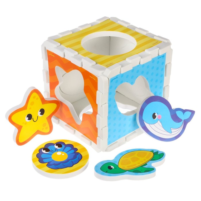 - 12 деталей в наборе — кубик-сортер с 6 гранями и 6 фигурок. Ребёнок подбирает подходящие элементы, тренируя мелкую моторику. Детали легко снимаются и крепятся обратно.