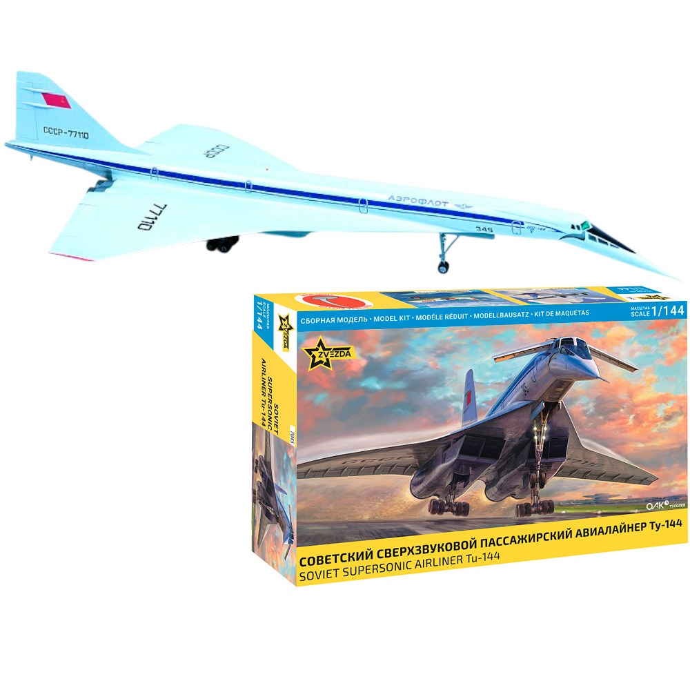 Набор конструктора от торговой марки Zvezda — это комплект для сборки уменьшенной копии советского сверхзвукового пассажирского авиалайнера Ту-144.
