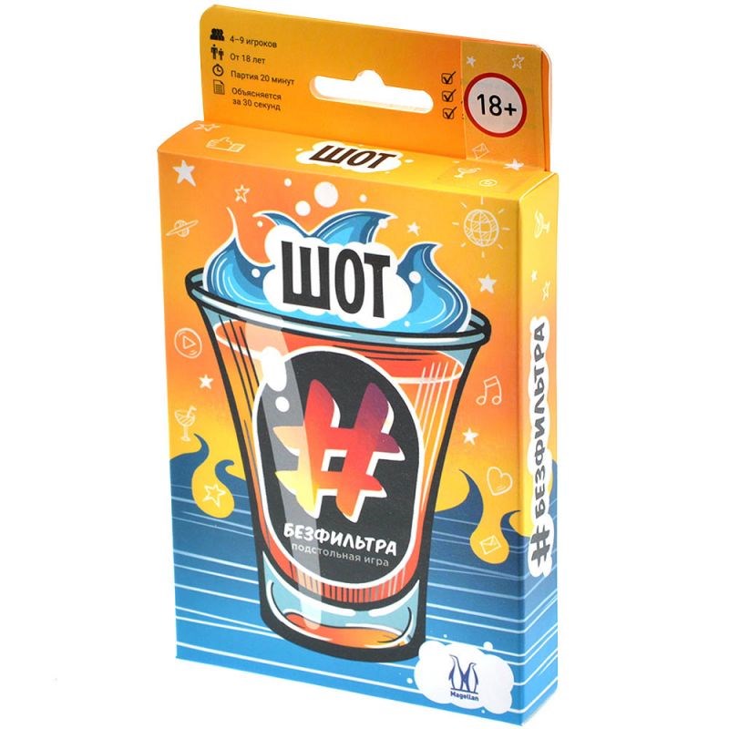 "Шот #безфильтра" – весёлая игра для разгорячённой компании. Вы либо выполняете задание, либо пьёте. Задания – про близость (вплоть до поцелуев), про откровенные разговоры и поступки. А ещё про соцсети – вот подписчики удивятся! С каждым заданием и с каждым глотком игра всё веселее и откровеннее.