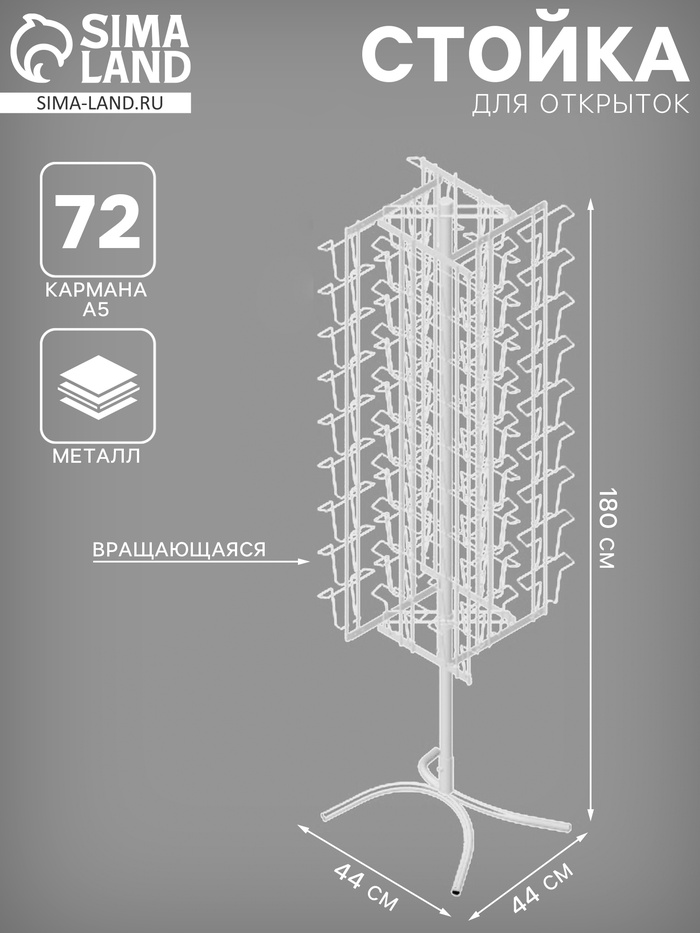 Вращающаяся напольная стойка для открыток на 72 кармана формата А5 — отличное решение для эффективной организации торгового пространства. Компактные размеры 44×44×180 см и универсальный белый цвет позволяют стойке легко вписаться в любой интерьер. Конструкция с вращением обеспечивает удобный доступ к открыткам, привлекая внимание покупателей и стимулируя интерес к товарам. Прочная и устойчивая, стойка идеально подходит для магазинов, выставок и торговых мероприятий, обеспечивая долговечность и удобство использования.