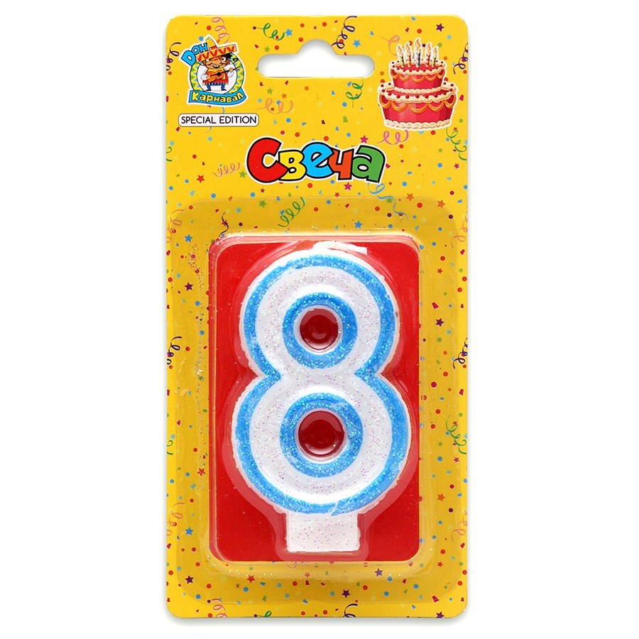 Свеча цифра "8" с синей окантовкой с блестками С-1106