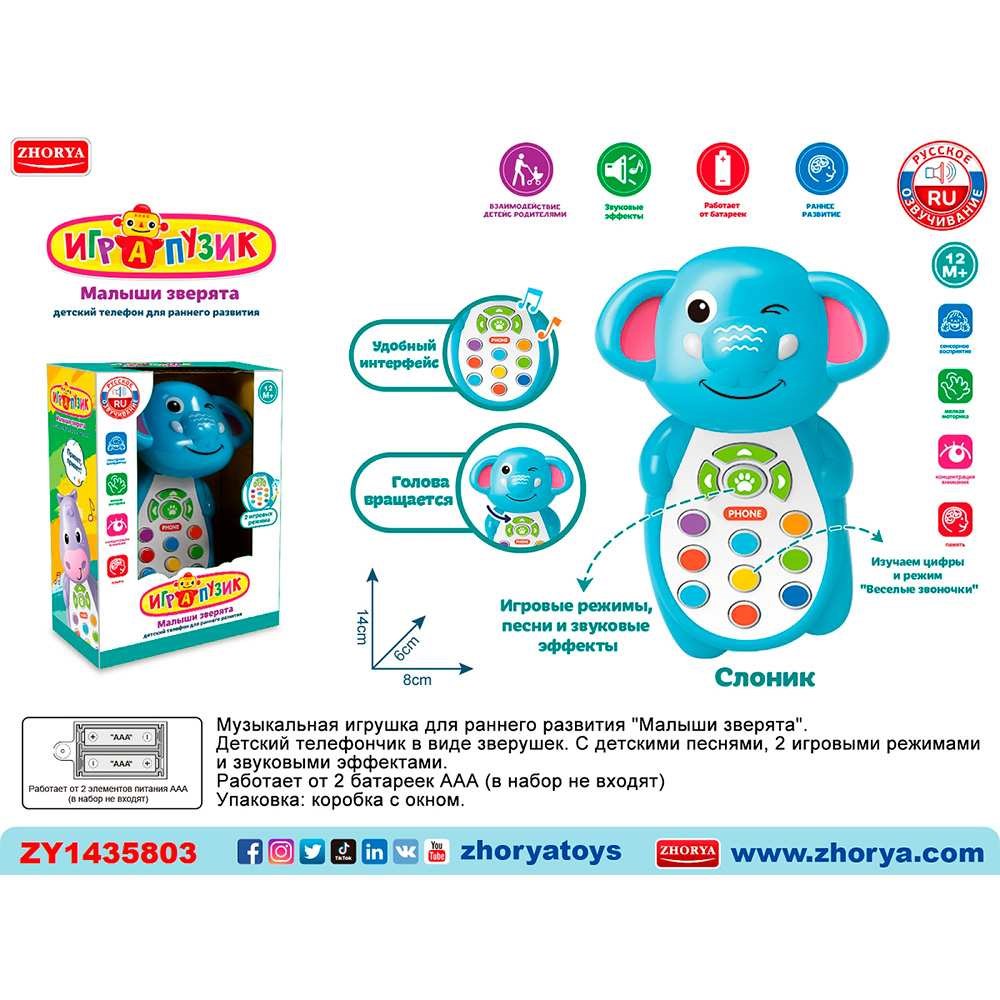 Телефон ZYA-A3220-1 Играпузик Слоник на батарейках, русск. озвуч., в кор.