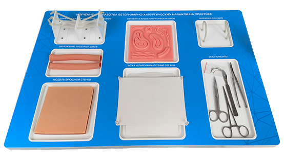 комплект базового хирургического инструмента и материалов для выполнения тренировок.