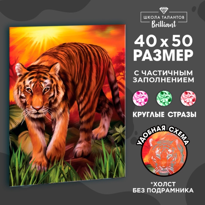 УЦЕНКА Алмазная вышивка с частичным заполнением «Тигр на закате» без рамы 40×50 см