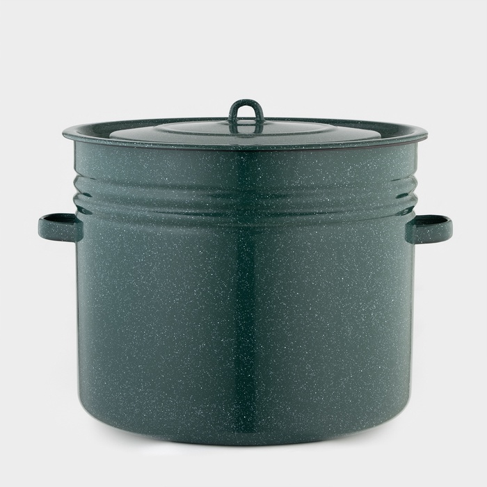 Эмалированный бак на 40 литров — ёмкость для тех, кто готовит в больших объёмах: варит компоты, солит овощи, томит борщи или стерилизует банки. Классический зелёный цвет без декора подходит как для городской кухни, так и для дачи. Гладкая эмаль легко моется, не впитывает запахи и не окрашивается от ягод или томатов. Крышка из той же эмалированной стали плотно закрывает бак, сохраняя тепло и предотвращая выпаривание влаги.