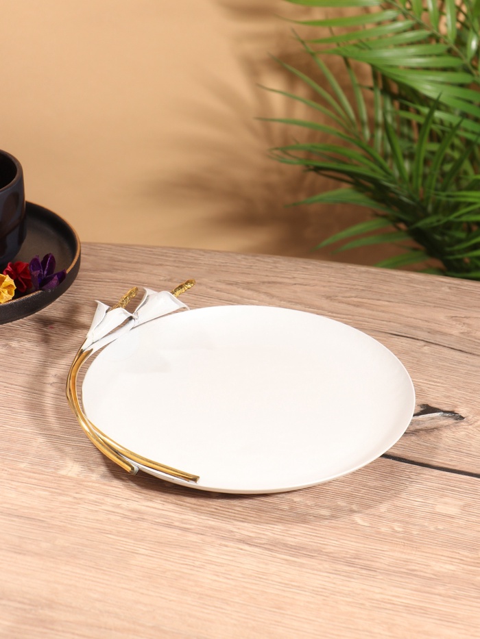 УЦЕНКА Блюдо сервировочное круглое «Белые каллы» белое с золотом. нержавеющая сталь 21×21.5×4 см 1