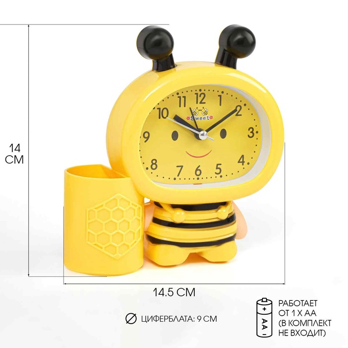 УЦЕНКА Будильник «Пчела», с карандашницей, дискретный ход, d=9 см, 14.5×14 см, желтый