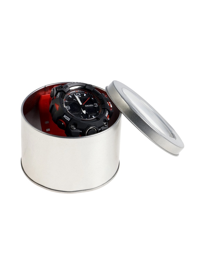 )Электронные наручные часы с будильником и водонепроницаемостью 5 АТМ сочетают стильный дизайн и практичность, корпус диаметром 5,6 см и яркий красный ремешок подчёркивают индивидуальность.
