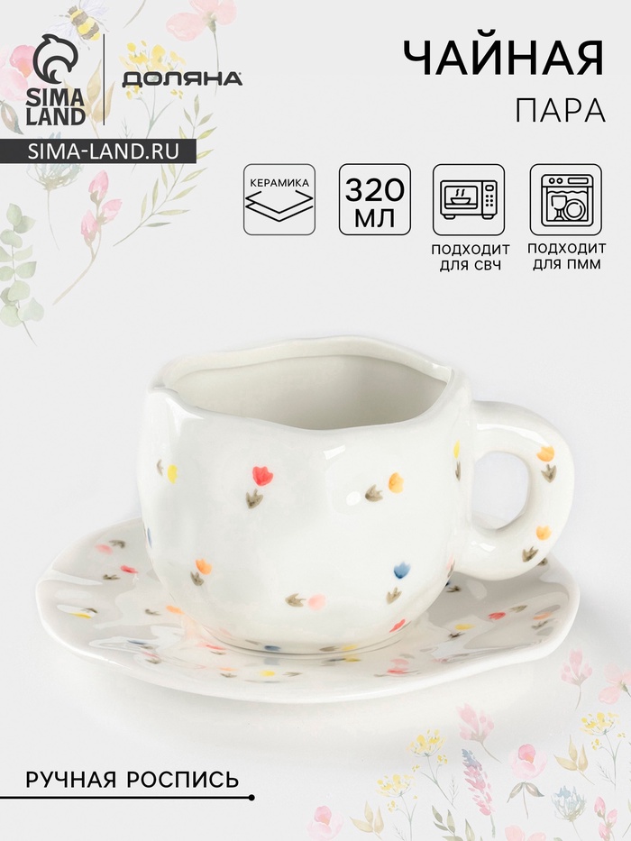 УЦЕНКА Чайная пара «Цветочное утро», 320 мл, ручная роспись, блюдце 16×1.5 см, кружка 12.5×9.5×7.5 см