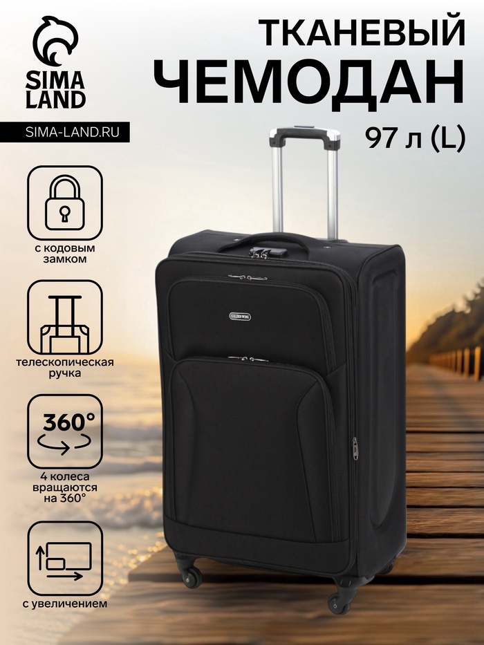 УЦЕНКА Чемодан на колёсах маленький 97 л (L), на молнии, с увеличением, кодовый замок, 4 колеса, чёрный