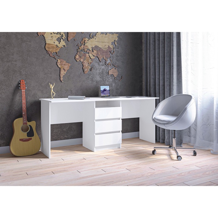 )Cтол письменный тандем Зара сочетает в себе преимущества просторного письменного стола, тумбы с одной открытой полкой и 3 выдвижными ящиками, превращаясь тем самым в полноценное рабочее место в офисе или функциональное место для школьников в детской комнате. На столе хватит места для двух ноутбуков и компьютеров, а ящики можно использовать для книг, канцелярии или документов. Письменный стол тандем Зара выполнен без ручек и лицевой фурнитуры. Стильные белые матовые фасады идеально впишутся в помещение в современном, лофт или скандинавском стиле.