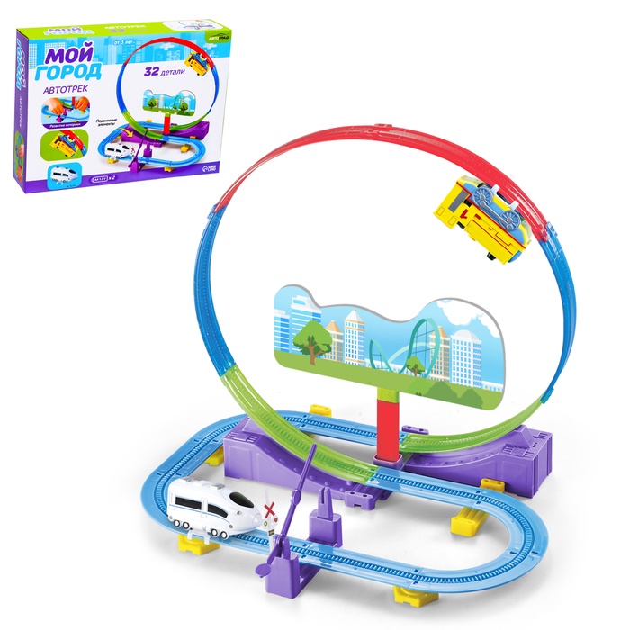 )Автотрек «Мой город» — железная дорога, состоящая из 32 деталей. Ребёнок соберёт трассу и отправит поезд в увлекательное путешествие!