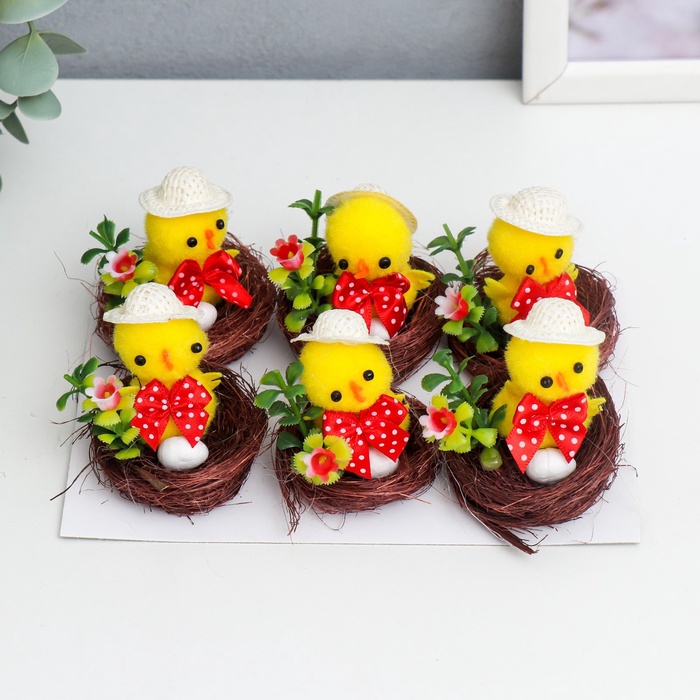УЦЕНКА Фигурки пасхальные «Цыплёнок в шляпке в гнезде с цветком», набор 6 шт., 3×4×4 см