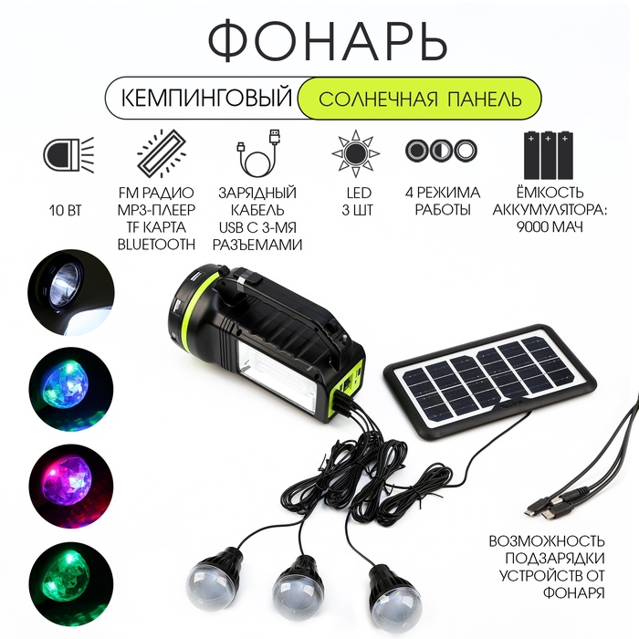 УЦЕНКА Фонарь кемпинговый аккумуляторный, с лампочками,10 Вт, 9000 мАч, солнечная батарея, USB