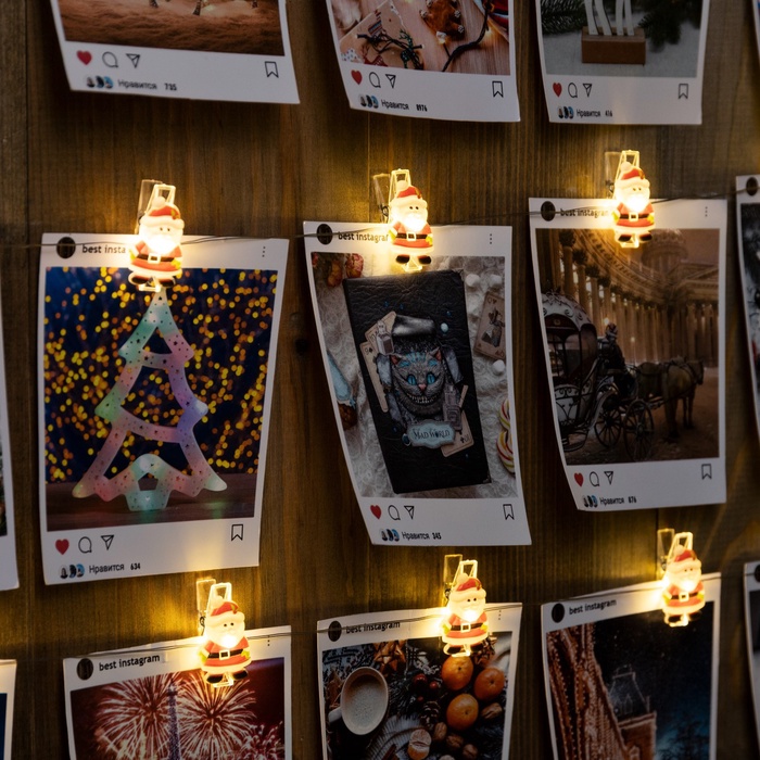 УЦЕНКА Гирлянда «Нить» 2 м, роса, с насадками «Прищепки с Дедом Морозом», IP20, серебристая нить, 20 LED, от батареек ААх2, свечение тёплое белое