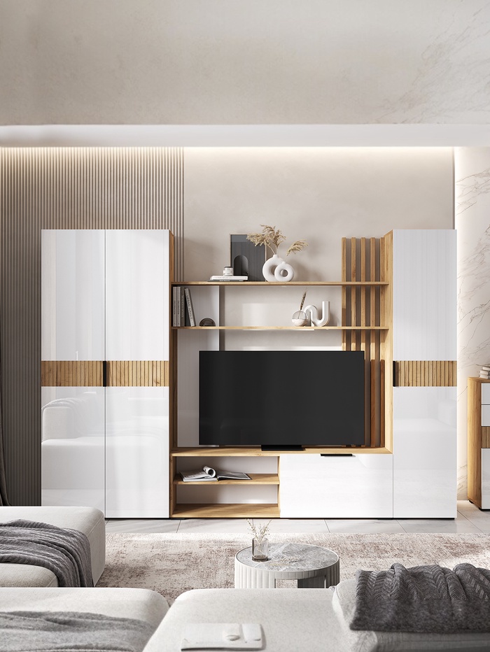 Дизайн в оттенках белого глянца и дуба крафт создаёт атмосферу уюта и современности, идеально подходя для любителей светлых и естественных интерьеров. Гостиная обеспечит максимальный комфорт в использовании.
