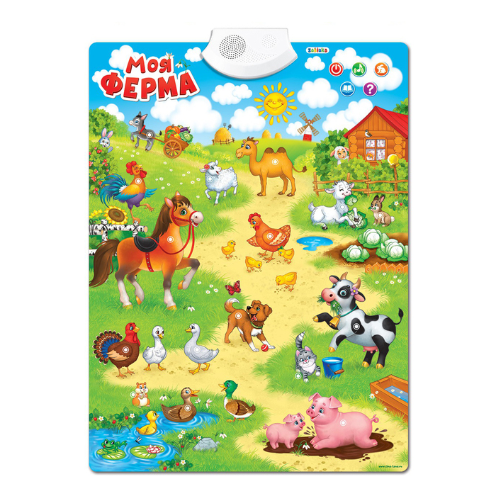 )Познакомьте ребёнка с миром фермы через игру! Говорящий плакат «Моя ферма» — это интерактивное пособие для малышей от 3 лет. Плакат помогает изучать домашних животных в увлекательной форме: с песнями, стихами и забавными звуками. Работает от 3 батареек AAA (в комплект не входят).