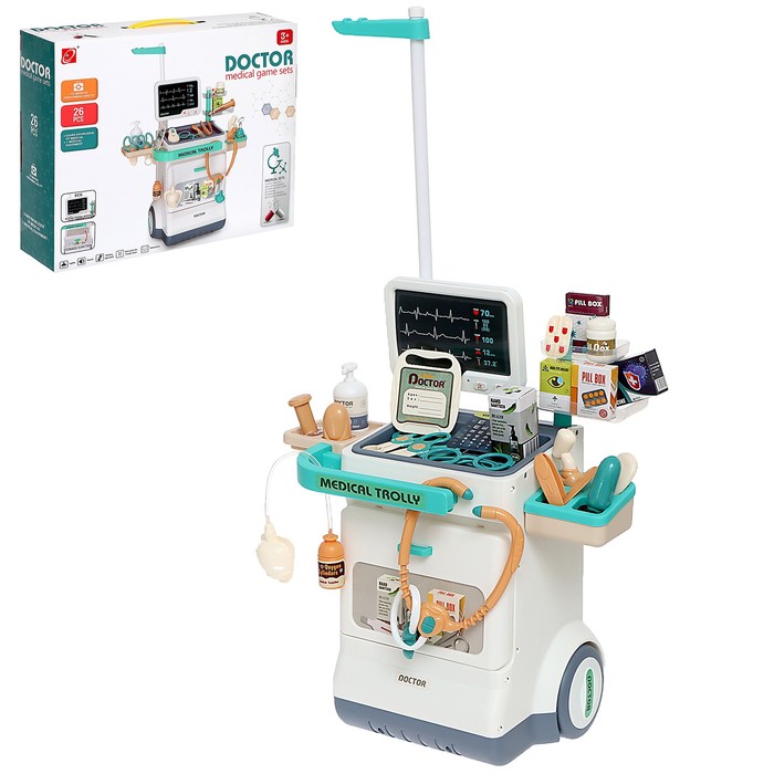 - 26 предметов, включая игрушечный стетоскоп, шприц, термометр и другие инструменты.