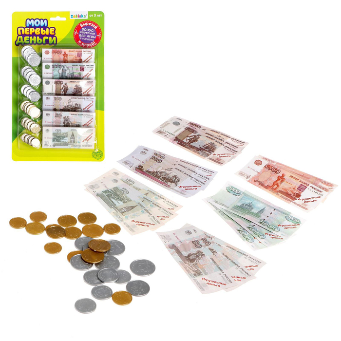 )Хотите научить ребёнка правильно обращаться с деньгами? Или сделать сюжетно-ролевые игры более реалистичными? Не проблема! Подарите малышу набор «Мои первые деньги». В яркий комплект входят банкноты и монеты, ценники, списки покупок, таблички со скидками и фишки. Ребёнок сможет разыграть множество сценариев, примеряя на себя роли банкира, продавца, покупателя, фермера и многих других персонажей.