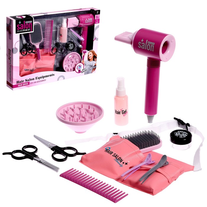 - 11 предметов в наборе: фен со звуком и двумя скоростями, расчёска, массажная щётка, безопасные ножницы, бутылочка-пульверизатор, заколки и баночки для аксессуаров. Всё, как в настоящем салоне!