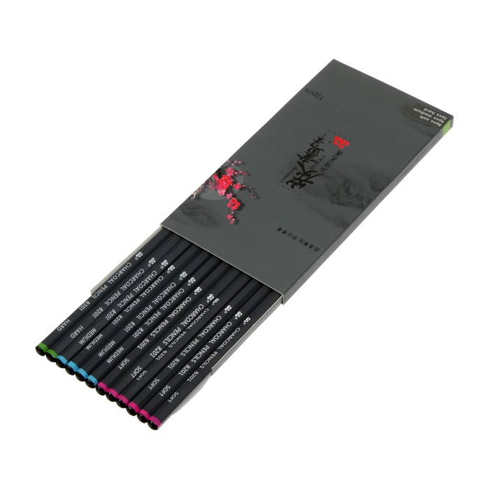 УЦЕНКА Карандаши угольные черные 12 штук в наборе (6шт-мягкий,4шт-средний,2шт-твердый)