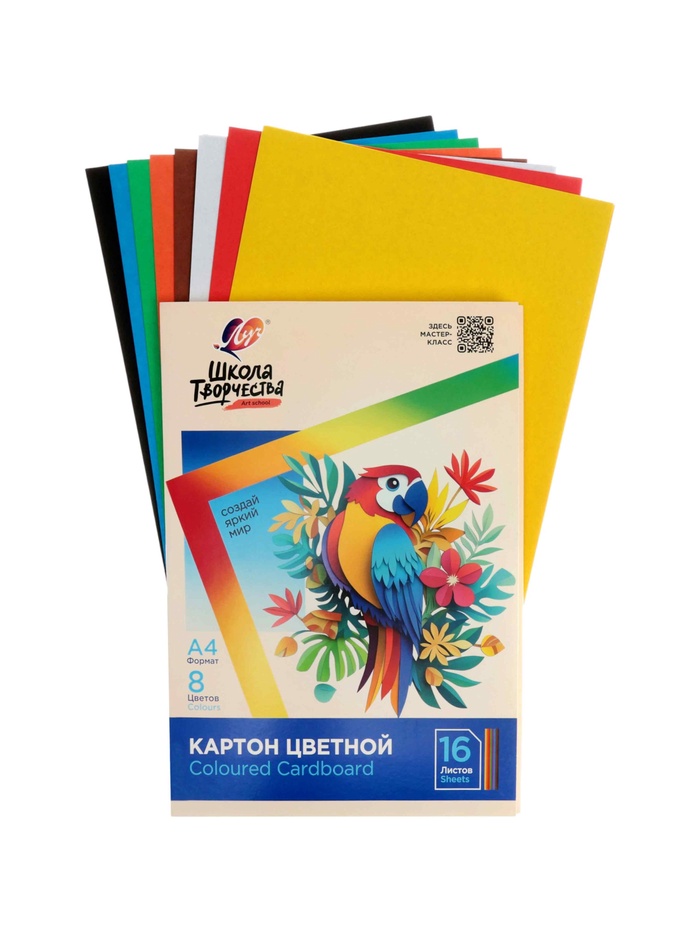 УЦЕНКА Картон цветной Луч «Школа творчества», А4, 16 листов, 8 цветов, немелованный, односторонний, плотность 220 г/м²