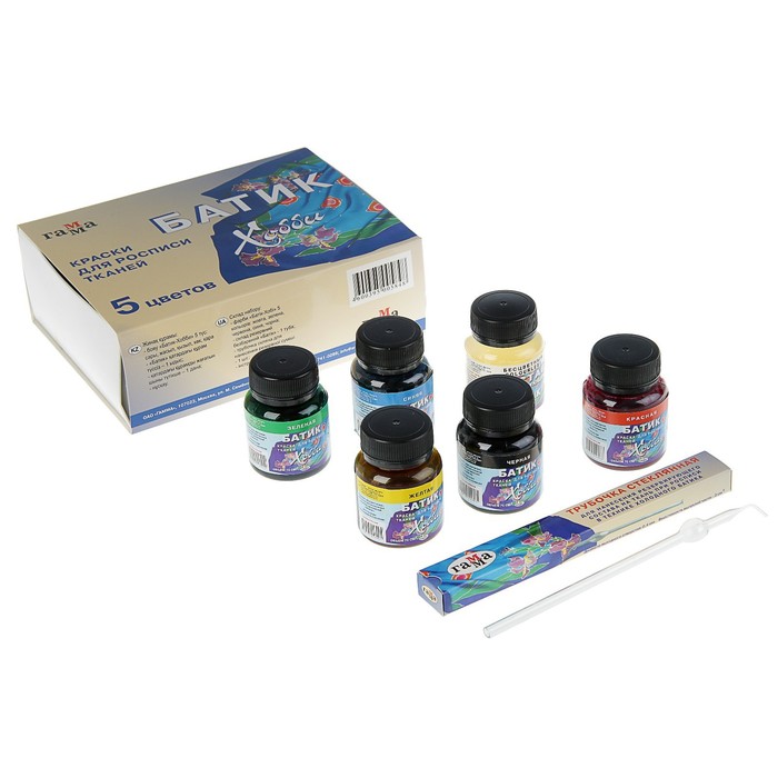 В наборе: 5 цветов красок, 1 баночка резервирующего состава, трубочка для резервирующего состава, инструкция.