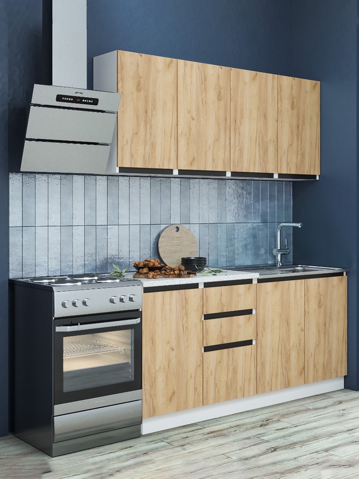 Современное и функциональное решение для компактных кухонь. Модель сочетает практичность, лаконичный дизайн и качественные материалы. Фасады выполнены в матовом исполнении, отсутствие ручек подчёркивает минималистичный характер кухни. Все элементы продуманы для удобного использования в повседневной жизни.