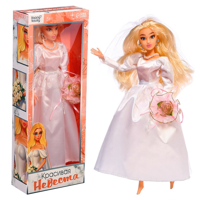 - Свадебный образ: Кукла одета в белоснежное платье. Длинные светлые волосы дополнены белой фатой. Тонкие украшения и нежно-розовый букет цветов придают образу особый шарм.