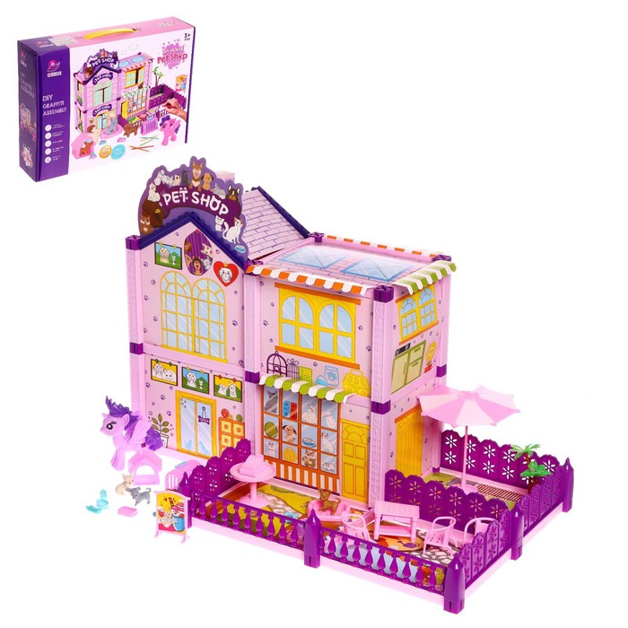В комплекте представлены 5 питомцев и аксессуары для них: миски, будки, бутылочки, кости, мебель, фломастеры.