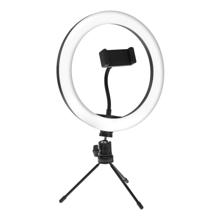 Светодиодная кольцевая лампа на штативе от LuazON поможет создать равномерное освещение для съёмок фото и видео. Штатив позволяет зафиксировать смартфон и регулировать его угол наклона. Для работы подключите устройство к адаптеру питания или к USB-розетке. Меняйте режимы и изменяйте яркость с помощью пульта на проводе.