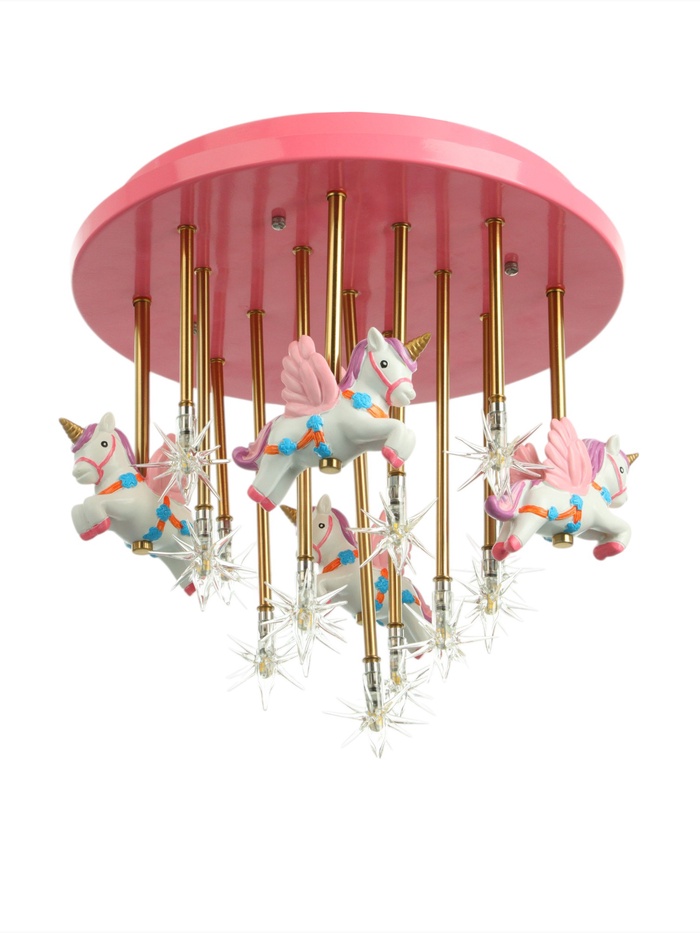 Создайте волшебный мир для маленькой принцессы! Потолочная люстра «Карусель» на 13 ламп — это розовое освещение для детской комнаты. Модель устанавливают прямо на потолок, она равномерно освещает пространство до 10 м².