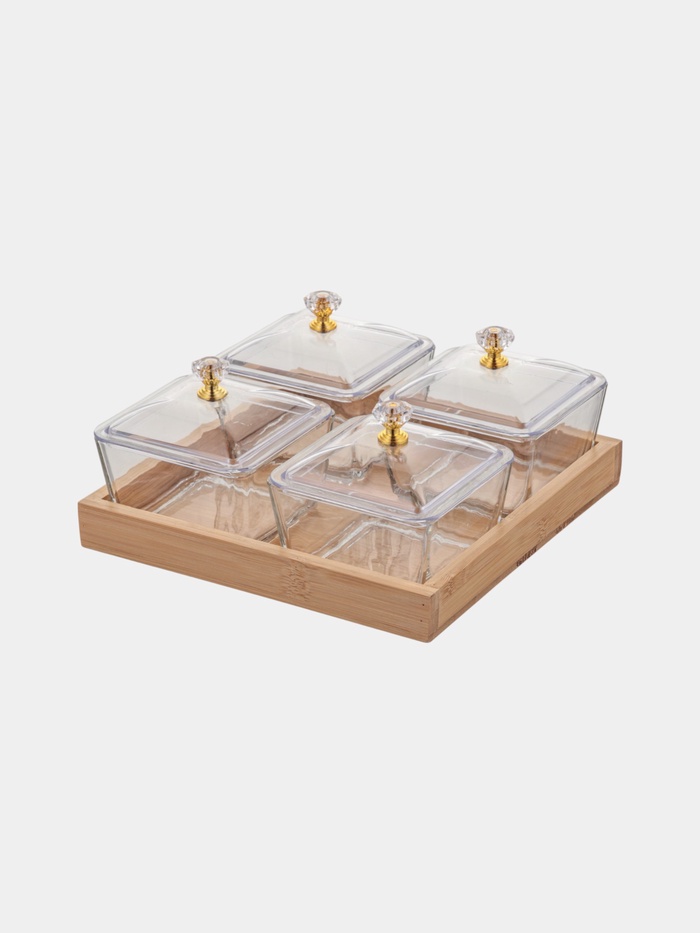 )Ёмкость менажницы «Голд» изготовлена из качественного прочного стекла, ручки и крышка из пластика, подставка из бамбука. Баночки можно использовать по отдельности как сахарницы, баночки для специй, чая. Такой набор будет эффектно смотреться на праздничном столе. В ёмкостях можно подавать десерты, закуски, деликатесы, и не переживать, что блюда заветрятся.
