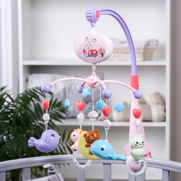 - 5 ярких игрушек над кроваткой медленно крутятся, привлекая внимание ребёнка. Их можно снять и использовать отдельно для игры.