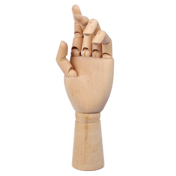)Деревянный маникен правой мужской руки применяется художниками в виде наглядного пособия для зарисовок, а также отлично подойдёт скульпторам или модельерам для примерки изделия, или изучения анатомии движения руки. Маникен изготовлен из дерева, высота 31 сантиметр, сгибается в фалангах пальцев и в области запястья , также возможно фиксирование маникена в необходимом положении.