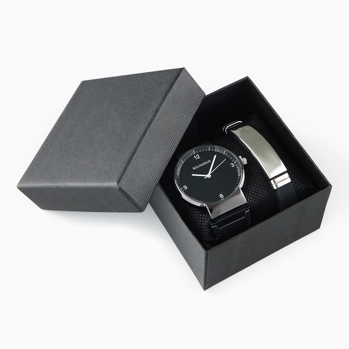 Набор включает наручные часы с циферблатом черного цвета и браслет с массивной бляшкой.