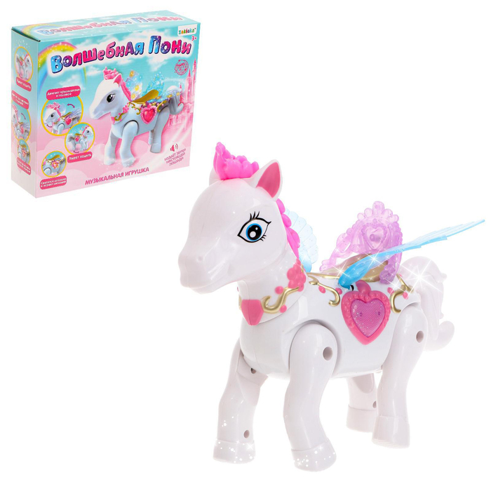 )Музыкальная игрушка «Волшебная пони» – это очаровательный друг для маленьких принцесс, который не только ходит, но и светится, машет крыльями, и двигает головой издавая мелодичные звуки. Эта игрушка станет настоящим сокровищем для девочек от 3 лет, подарив им часы веселья и волшебства.