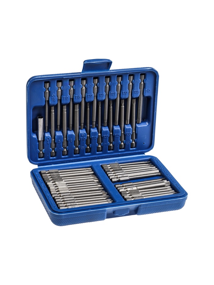 - Система хранения: Прочный кейс с прозрачной крышкой предохраняет комплект от потерь. Каждая бита фиксируется в индивидуальной ячейке — легко контролировать наличие всех насадок.