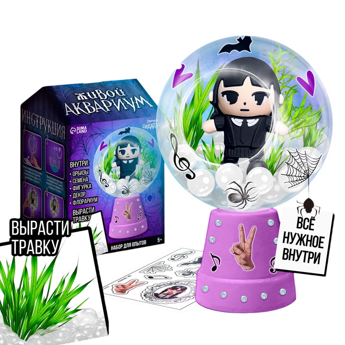 )Набор для опытов «Живой аквариум: Мрачная история» станет прекрасным способом занять детей и показать им процесс прорастания семян. Ребёнок самостоятельно проведёт эксперимент с шариками-растушками, вырастит декоративную травку в домашних условиях, и научится ухаживать за растением.