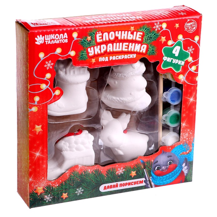 В набор входит:4 гипсовые подвески-основы, 6 акриловых краски и кисть.