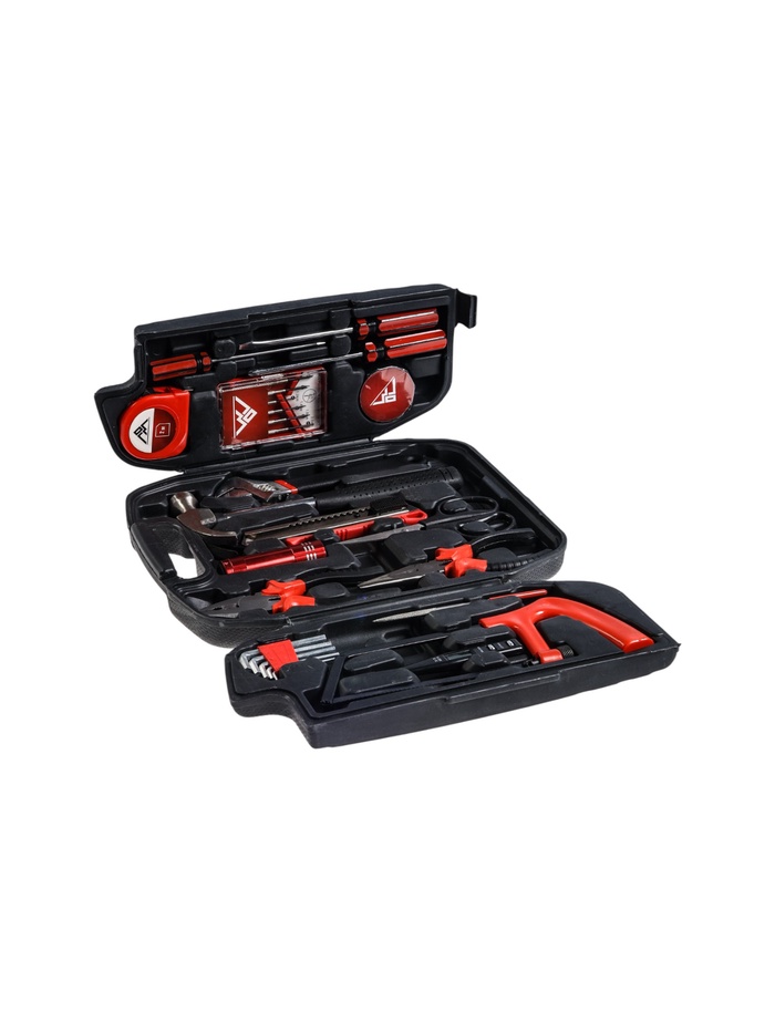 Составляющие набораДлинногубцы, Молоток, Нож, Ножницы, Ножовка, Плоскогубцы, Разводной ключ, Рулетка, Тестер, Фонарь, Шестигранные ключи
