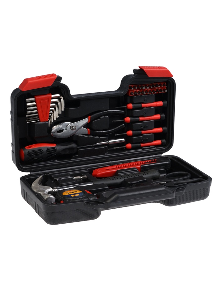 - Полная комплектация — 39 предметов: В набор входят торцевые головки, биты, шестигранные ключи, плоскогубцы, нож, рулетка и ножницы. Такой набор закрывает основные задачи по дому — от сборки мебели до мелкого ремонта.