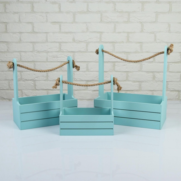 Набор деревянных кашпо «Аром» голубой, 3 шт. — декоративные кашпо с текстильными ручками для создания композиций. Комплект предназначен для установки на горизонтальные поверхности и служит для оформления интерьера срезанными цветами или сухоцветами.