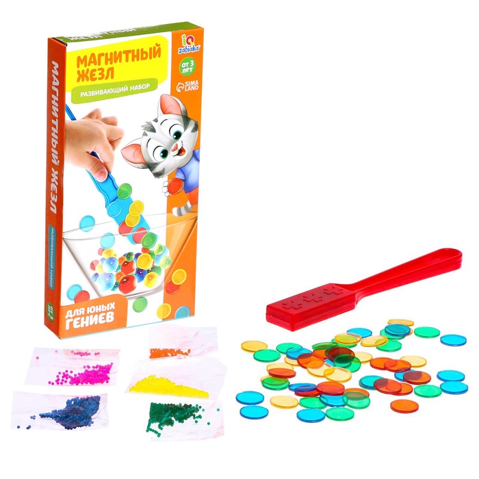 Придумайте множество увлекательных обучающих игр. Например, спрячьте магнитные фишки в ёмкости с растущими шариками, водой, песком или другими сыпучими материалами. Изучайте удивительные эффекты магнетизма с помощью волшебного жезла!