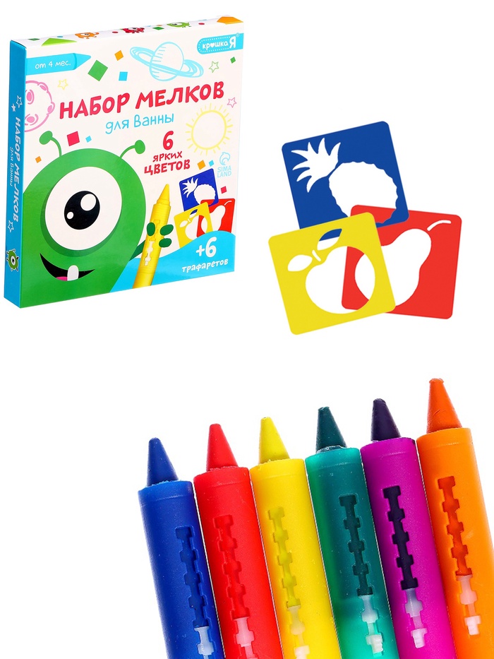 )Набор для рисования в ванной с трафаретами станет отличным развлечением для маленьких художников. В комплект входят 6 цветных мелков и 6 трафаретов, которые помогут создать яркие рисунки прямо на плитке или стенах ванной. Такие занятия подарят ребёнку радость творчества и сделают процесс купания ещё интереснее.