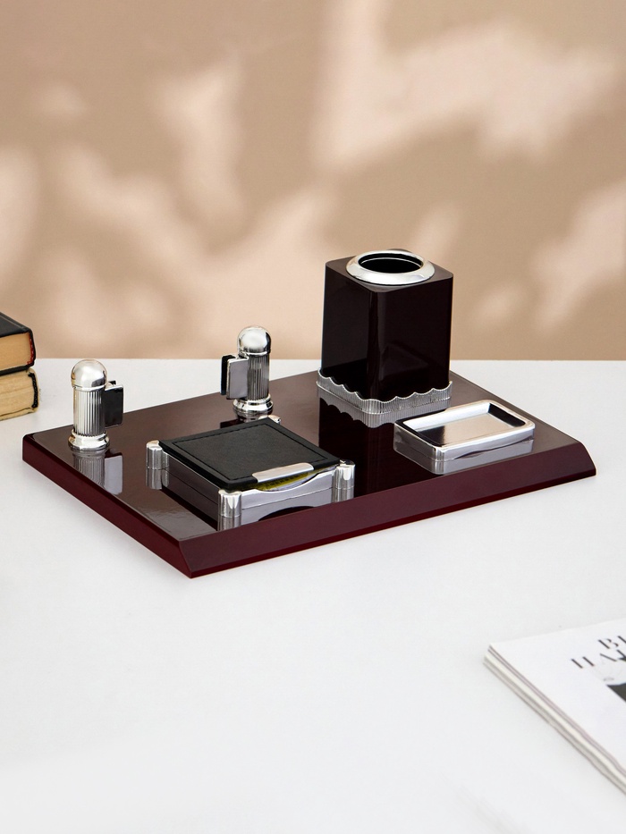 Компактный настольный набор поможет избежать хаоса на рабочем месте. Храните в нём канцелярские принадлежности или другие мелочи, чтобы правильно организовать пространство. К тому же изделие имеет минималистичный дизайн и выполнено под дерево, поэтому оно украсит собой любое место как декоративный элемент.