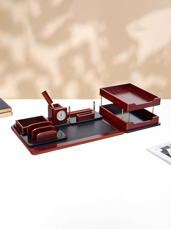 Компактный настольный набор поможет избежать хаоса на рабочем месте. Храните в нём канцелярские принадлежности или другие мелочи, чтобы правильно организовать пространство. К тому же изделие имеет минималистичный дизайн и выполнено под дерево, поэтому оно украсит собой любое место как декоративный элемент.