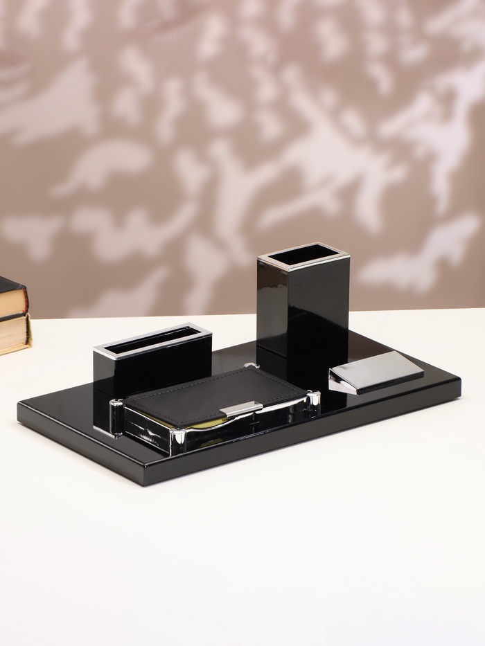 Компактный настольный набор поможет избежать хаоса на рабочем месте. Храните в нём канцелярские принадлежности или другие мелочи, чтобы правильно организовать пространство. К тому же изделие имеет минималистичный дизайн и выполнено под дерево, поэтому оно украсит собой любое место как декоративный элемент.