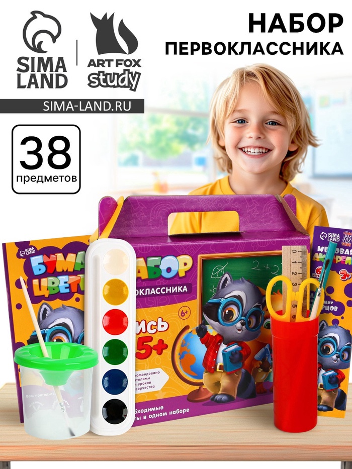Составляющие набораАльбом, Закладка, Карандаш, Кисть, Краски, Ластик, Линейка, Ножницы, Обложка для тетради, Пенал, Расписание, Тетрадь