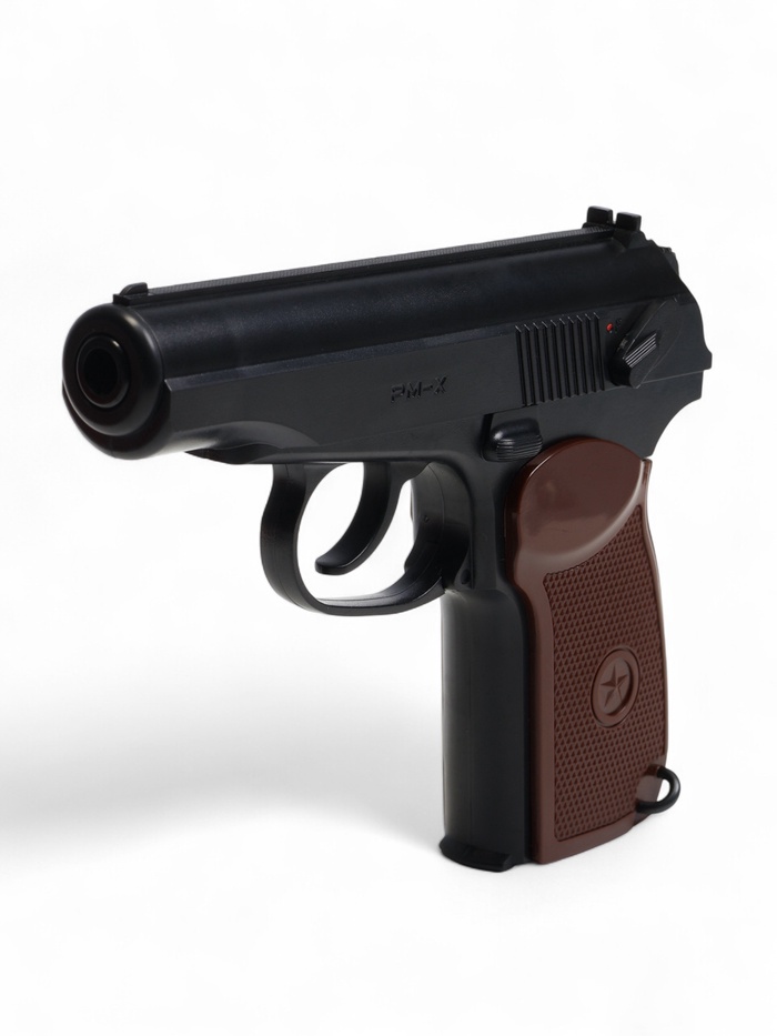 На вылете пуля набирает скорость до 100 м/с, при этом показатель дульной энергии пистолета Borner PM-X не превышает 3 Дж, поэтому приобрести его могут все желающие, без необходимости оформления разрешений и лицензий. Внешний вид пистолета также соответствует боевому прототипу в его классическом исполнении – корпус окрашен в черный цвет, на рукоятке пластиковая коричневая накладка с рифлением и пятиконечной звездой в центре.